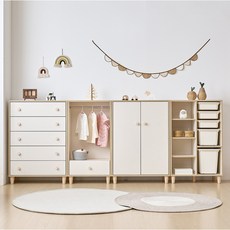 유아동용 수납장 세트로 옷장과 5단 서랍장을 포함하여 넉넉한 수납 공간 제공
