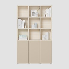 다목적 수납 공간을 제공하는 두 종류의 문으로 구성된 책장으로, 다양한 수납 요구 사항에 대응할 수 있음