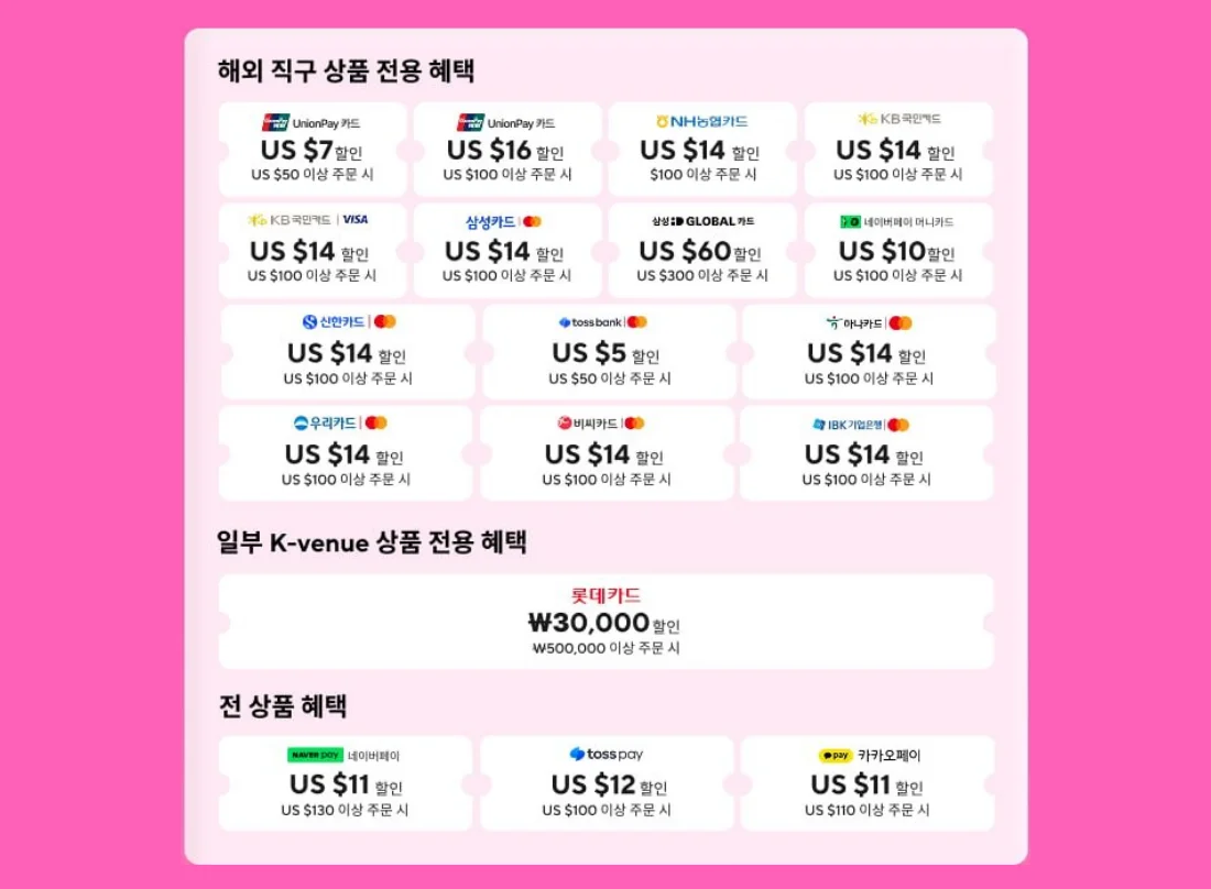 – $100 이상구매시, $14 즉시할인: 비자카드(KB국민, NH농협), 마스터카드(삼성, 신한, IBK기업, 하나, 우리, BC, NH농협)